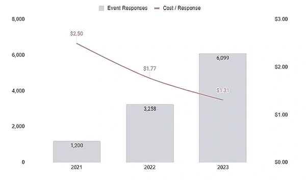 In 2023, I doubled down on the same strategy, further focusing budget towards new customer acquisition. For the second straight year, I was able to deliver the most successful weekend in company history. With a 20% higher budget, I was able to increase event response volume by an additional 87% while further driving down Cost / Response by 26%. Continuous improvement in 2023 was a product of growth in the existing customer base following efforts in 2022. This allowed me to deliver a lower overall Cost / Response, as existing customers came at a much lower cost.